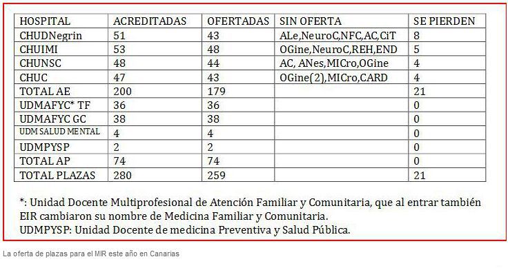 Desde nuestro sindicato llevamos tiempo denunciándolo y exigiendo a nuestros gestores soluciones planificadas. En Canarias se cumplió aumentando los alumnos en las facultades, de 85 a 150 (decisión “más bien política” en su momento) en GC hace, unos años, y manteniendo en 130 la ULL. Viendo la oferta MIR en Canarias, está proporcionado. Pero el problema viene del resto del país, donde los números clausus y la producción de médicos en las facultades públicas y privadas se ha disparado, y es lo que ha descompensado la oferta y demanda de médicos y, médicos especialistas. Se suma que la crisis hizo que se disminuyeran las plazas MIR, unas 1.200 en 5 años y, la falta de crecimiento en contrataciones de especialistas durante esta crisis y la malísima gestión de las ofertas de empleo, sobre todo, en Canarias, han contribuido, junto a las jubilaciones masivas de los próximos 6 años, a que habrá falta de especialistas en muchos centros del país, más en AP que en hospitales, habiendo muchos médicos sin poder especializarse, por falta de plazas MIR y el exceso de producción que se ha propiciado.